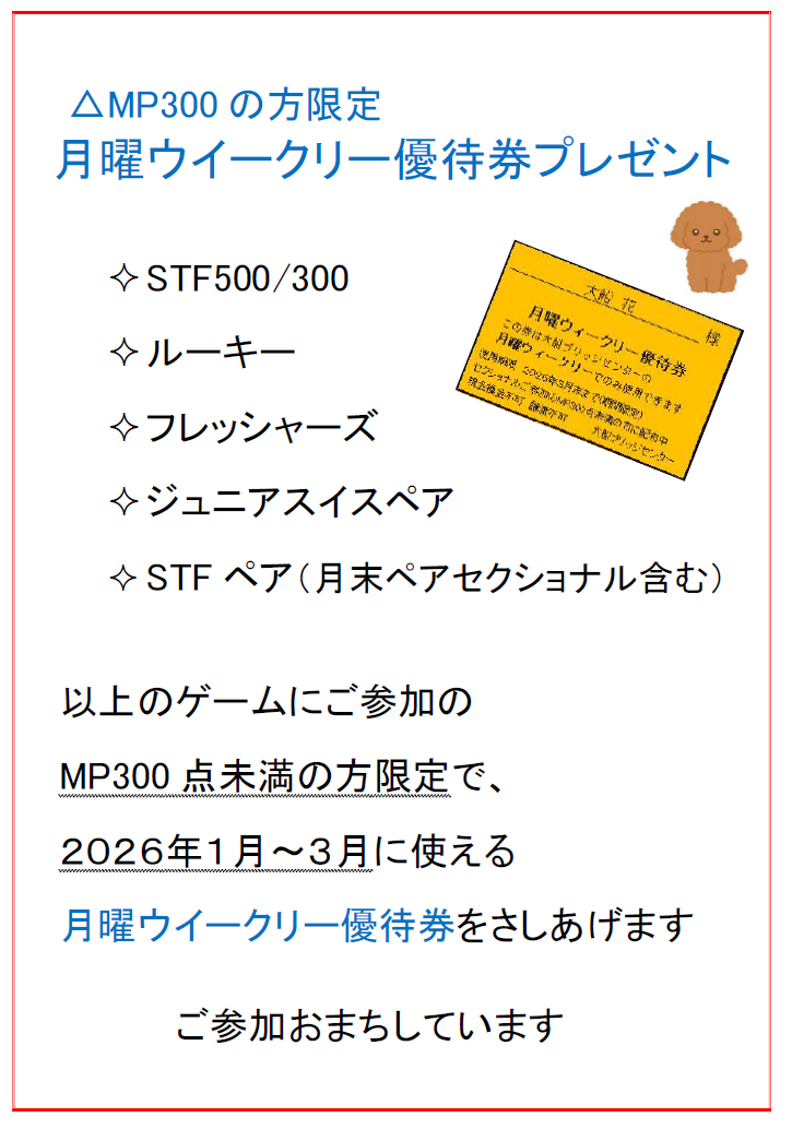 2月11日(祝)JBTA杯(OP/△1500/△300)STFペア 賞品多数