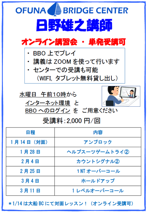 オンラインでも対面式でもどちらからでも参加可 オンライン講習会が初めての方でも ZOOMとBBOに接続できる環境があれば参加可能! お申込みは online@ofunabc.jp まで お名前、BBOユーザー名、受講希望のレッスン名を明記の上 メールをお送りください。