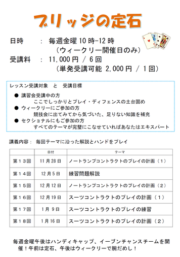 28日(金)10時 ブリッジの定石 13時 ウィークリーイーブンチャンス キャンナス鎌倉さんがいらっしゃいます