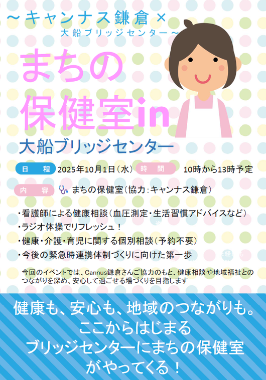 キャンナス鎌倉さんにお越し頂き、健康相談、血圧測定、ラジオ体操など、予定しております。