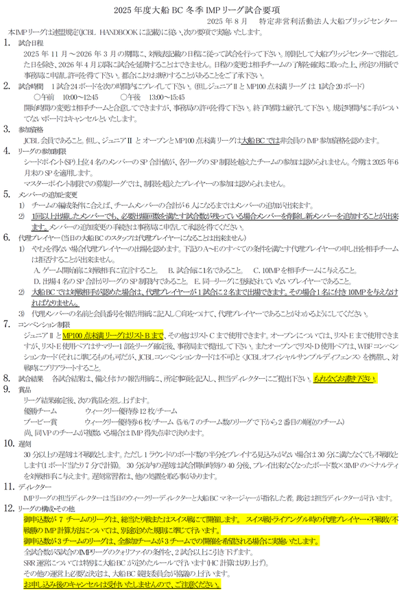 冬季IMPリーグ対戦表はこちらから IMP参加で今年は県知事杯で参加特典あり